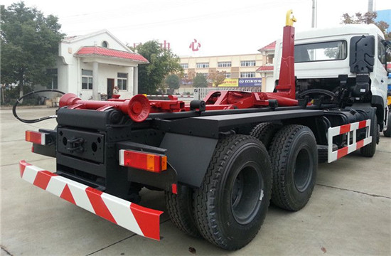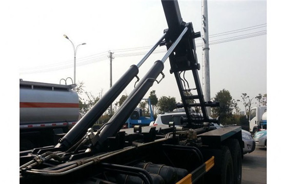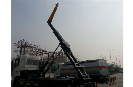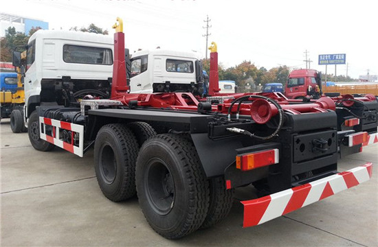 东风天龙双桥25吨钩臂式垃圾车上装配置:高强度合金钢一体式主勾臂,加强型副梁,铸钢加宽尾托轮,手动+遥控双操控装置,液压完成上箱+下箱+锁紧+自卸等作业,实现一侧多箱的循环转运。