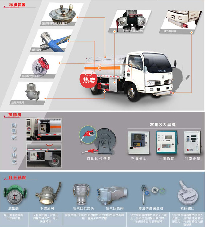 | 前盘(碟刹)后鼓刹:用于紧急制动情况下,保证车辆能有效刹车的专用装置,目前油罐车上牌必须的部件之一; 主要安装于:前轮靠两片铸铁加住一个圆盘的制动体系,这个能够看到;而后轮的刹车是靠闸皮的胀大制动的,这个就叫前盘后鼓。 | 防溢漏探头:一般安装于罐口入口旁边; 用途:防溢电子传感器广泛用于各类容器罐在密闭充装液体时,为防止液体暴满外泄而提前报警的一种装置,它安装在容器罐的顶部人孔盖上,当油位达到警示限位时,传感器将自动报警断闸. |