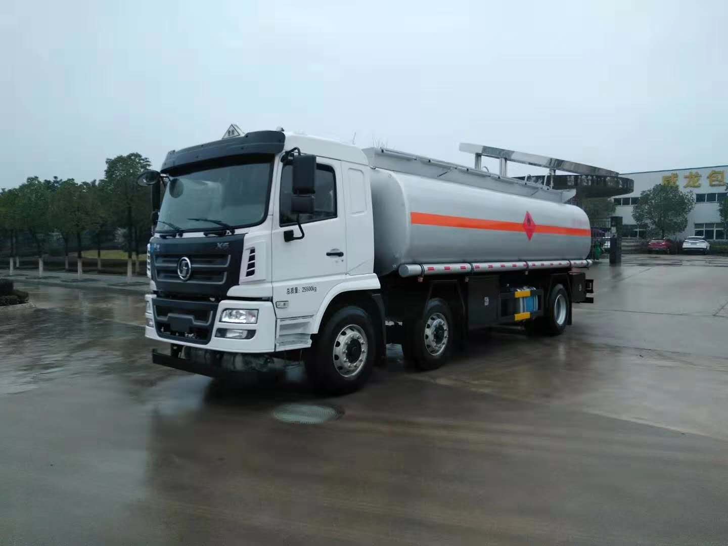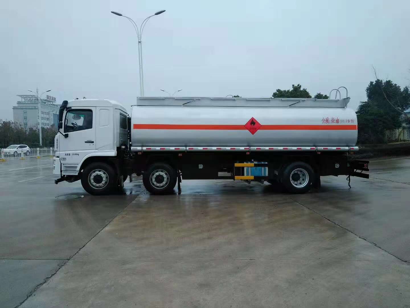该车为危险品车辆,危险货物运输车辆的类型为FL型,类项号:3;罐体有效容积:19立方米,介质:柴油,汽油,煤油,密度(千克/立方米)分别为:830,700,800;罐体尺寸(长×长轴×短轴)(mm)为:7200×2380×1620,7200×2180×1520;侧、后防护均采用Q235材质螺栓连接在大梁上,后防护装置断面尺寸为(mm):140×50,后部防护离地高度:450mm;ABS系统生产厂家:西安正昌电子股份有限公司,型号:ZQFB-V;随底盘选装驾驶室,排气管前置,前轮盘式制动器,安装限速装置,限速80km/h.安装具有卫星定位功能的行驶记录仪,转向轮装备轮胎爆胎应急防护装置;发动机型