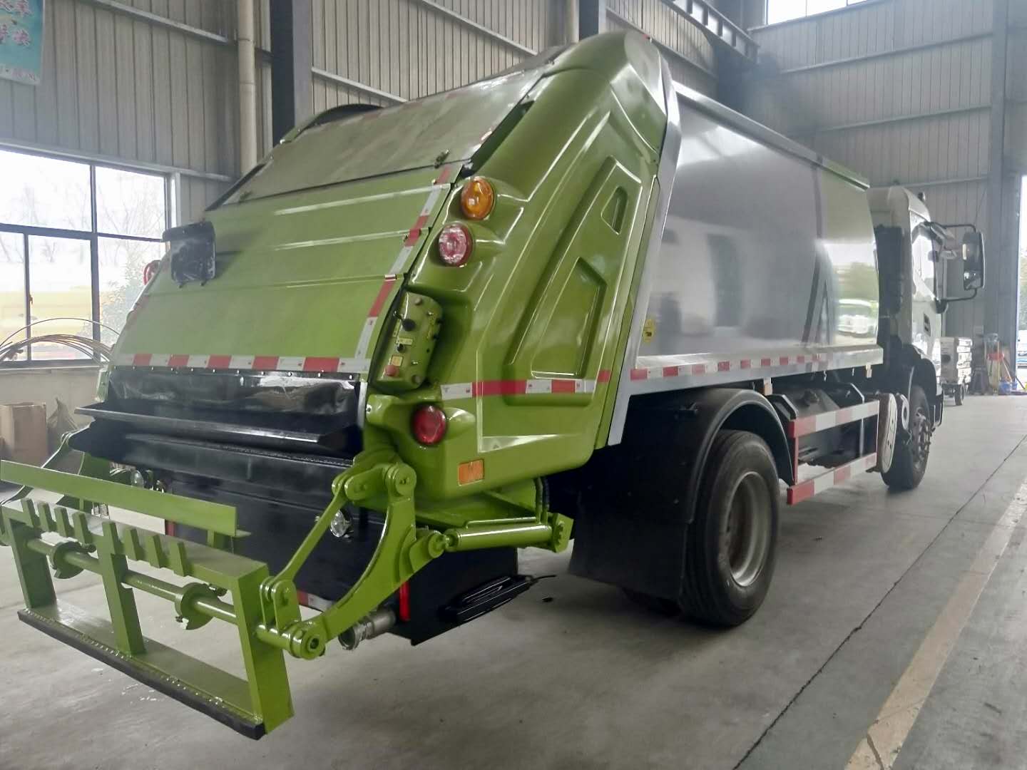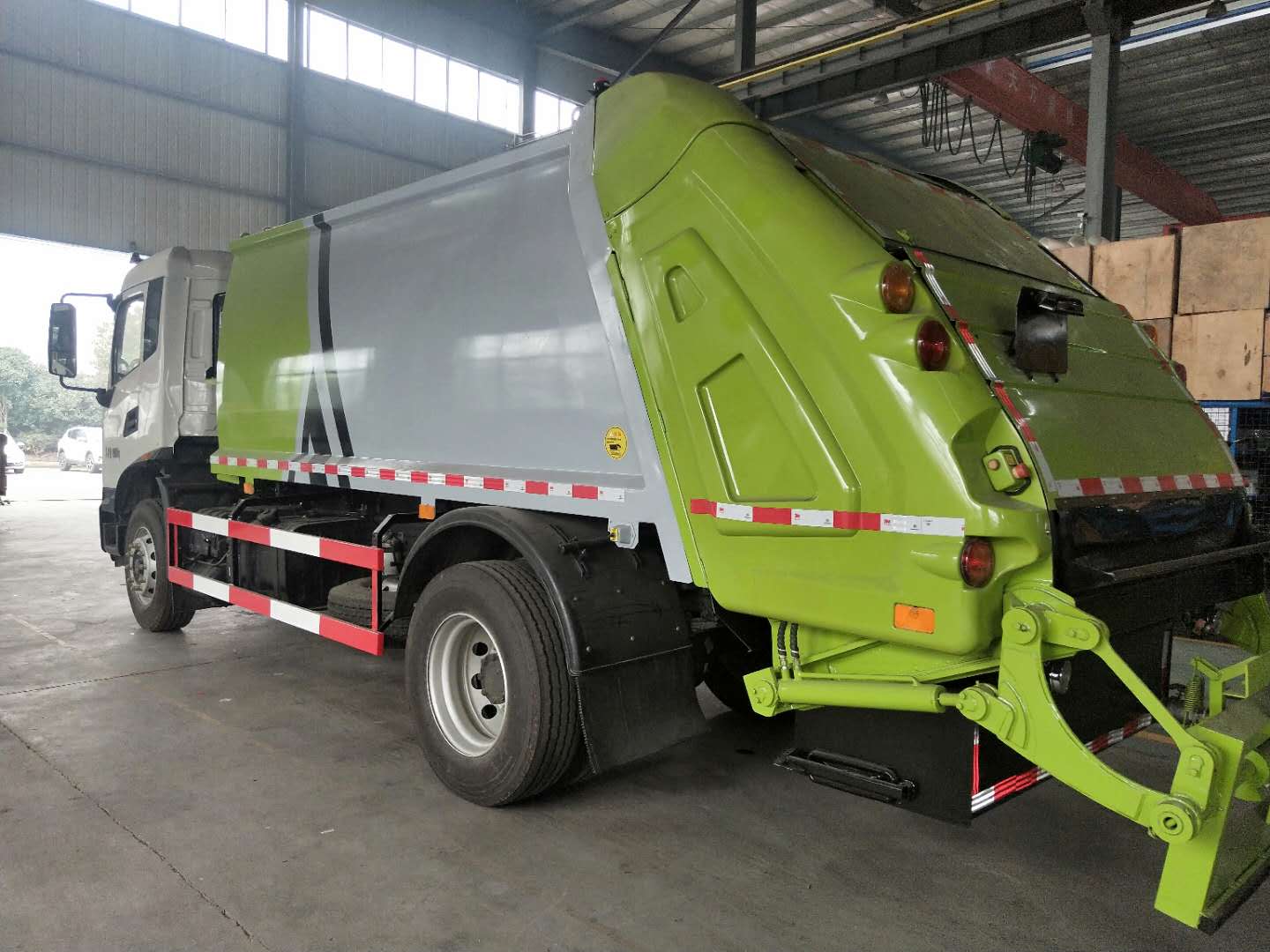 ③ 框架结构 垃圾箱采用加强梁和钢板焊接而成牢固的框架结构,侧面和顶面为圆弧曲面,外形美观,重量轻,受力好,不变形;推铲由矩管骨架和折面板构成,不仅结构轻巧,又能使垃圾均匀分布,卸料干净彻底;填装器主要由填装器壳体、滑板、刮板等构件组成,各构件采用受力良好的梁板或箱型结构,结构牢固,重量轻。