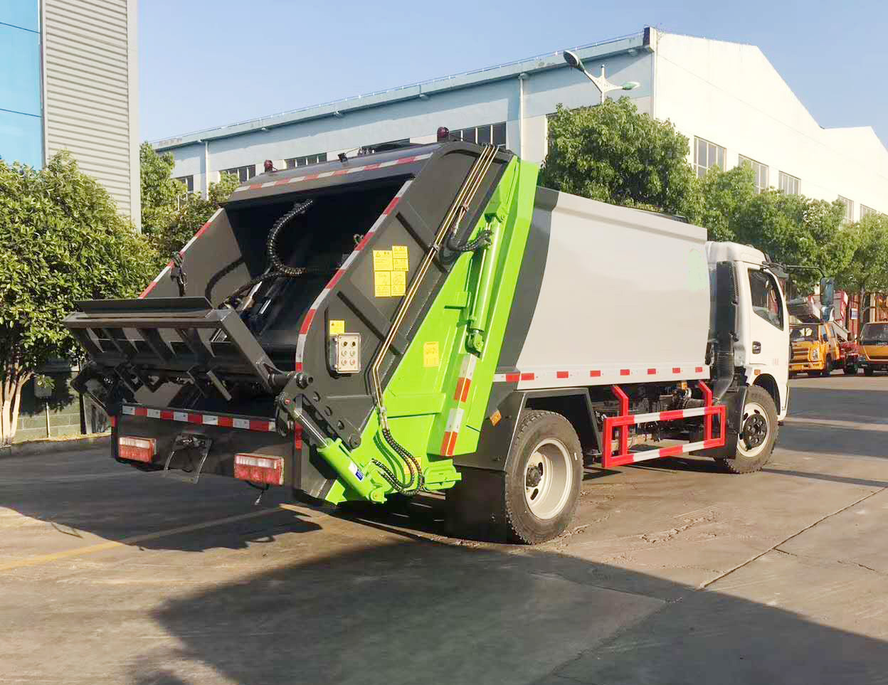 ⑨ 方便的操作控制 作业控制盒分别安装在驾驶室内和车尾,驾驶室内的作业控制盒可控制推挤卸料和选择操作模式(如自动或手动),车尾的作业控制盒则控制压填机构和翻桶机构的作业,使用操作十分方便。特别是在垃圾填埋场,作业人员无须下车即可完成卸料和污水排放。