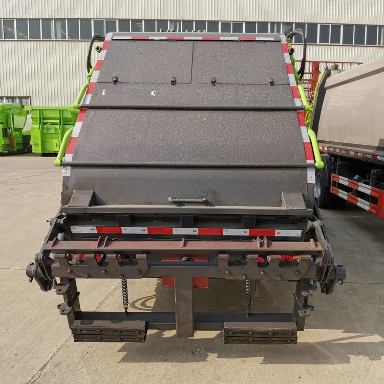 ④ 密封处理消除二次污染 垃圾在压缩装填和运输过程中处于封闭状态。垃圾箱与填装器接合面装有特制的橡胶密封条,采用锁紧装置压缩密封;污水箱上安装有独特的排污阀,密封可靠,不易堵塞。填装器盖选装完全遮盖住填装器投料口,消除转运过程车尾气流扰动造成垃圾尘屑飞扬的现象,外观更加美观。