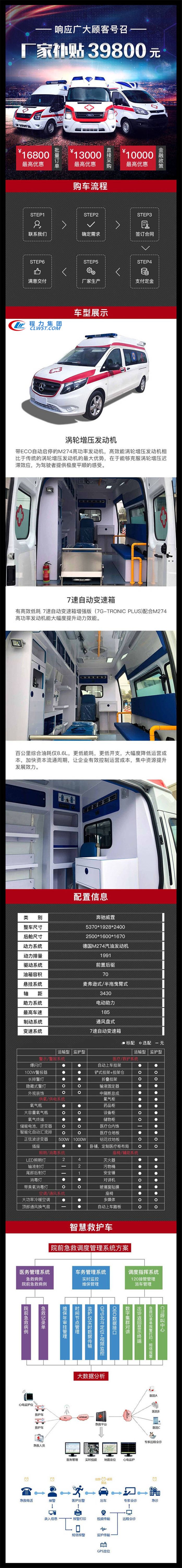 该车配备医疗器械柜,担架,特种车辆标志灯及警报器等救护专用装置;带OBD;ABS厂家:博世汽车部件(苏州)有限公司,ABS型号:ESP9;发动机大净功率为155kW;选装低换气扇,选装异形顶部图片. |