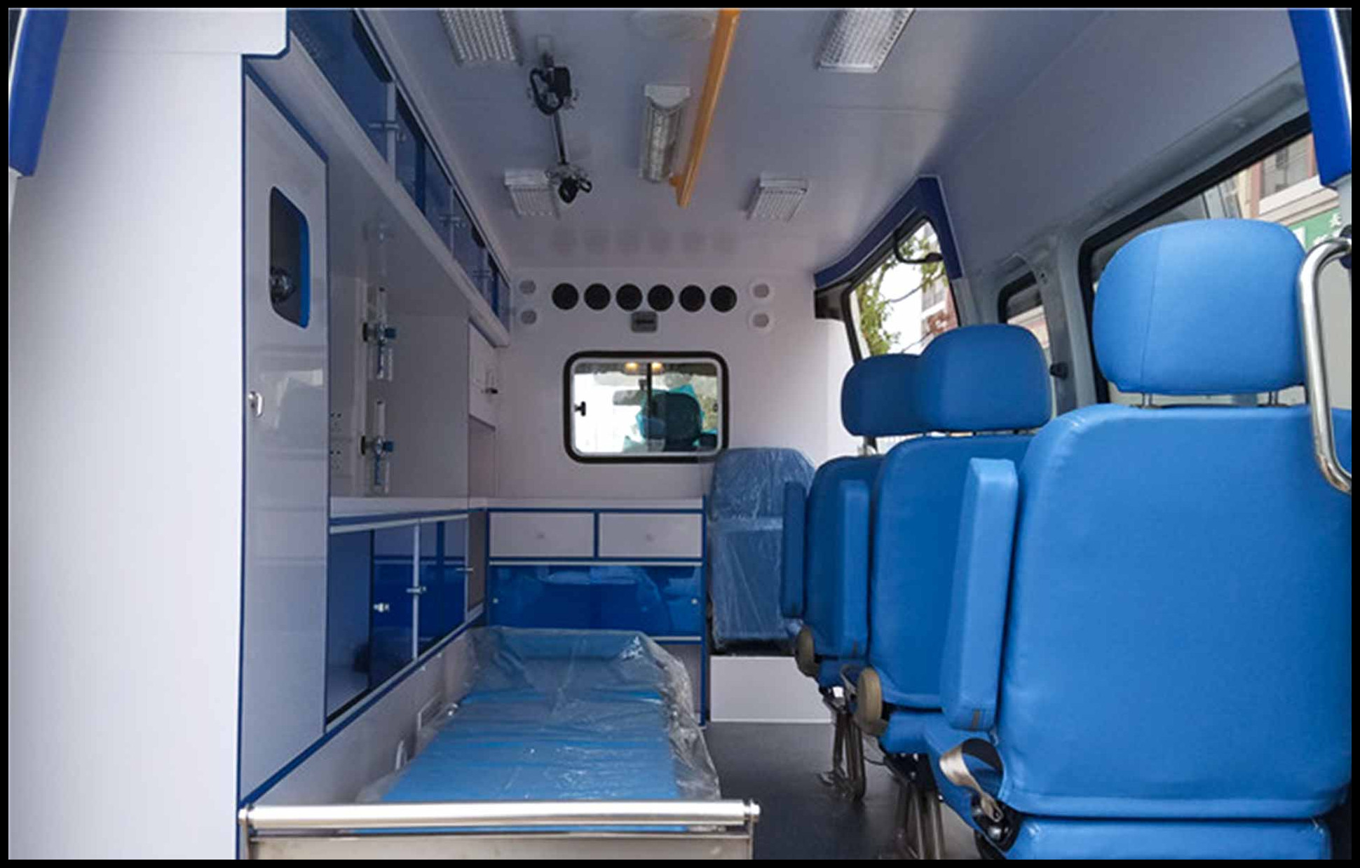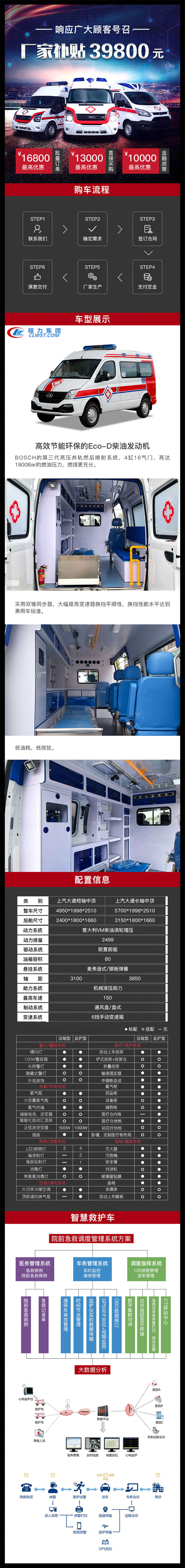 该车配备医疗器械柜,担架,氧气瓶,消毒灯等救护专用设备.选装车顶、双侧移门、推拉侧车窗、钢轮圈、侧爆闪灯、后爆闪灯、换气扇、侧踏步、后踏步、前格栅、尾标,不选装后踏步车长5700mm.选装后踏步车长5910mm,一体式后踏步整车长度5785mm,装中顶车高2540mm.选装高顶车高2747mm,中顶选装异型顶车高为2480mm.高顶选装异型顶车高2630mm.该车型可以不装前雾灯,不装高位制动灯.ABS生产厂:博世汽车部件(苏州)有限公司,博世汽车部件(苏州)有限公司,ABS型号:ABS 9,ESP9.发动机大净功率: