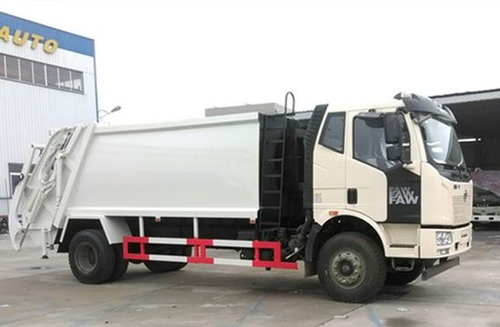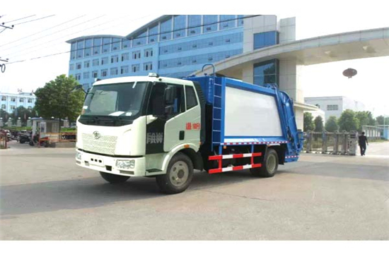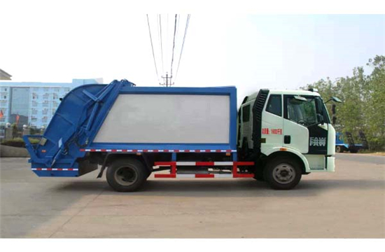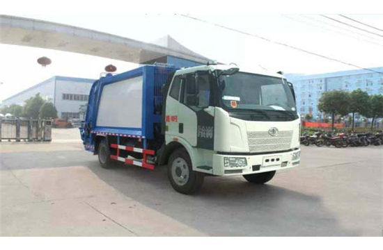 解放J6型12方压缩式垃圾车(上装配置):有效压缩容积12立方,可装12吨生活垃圾,压缩倍率3-4倍,压缩后生活垃圾密度从0.36变为0.95以上,带污水收集箱,新款平板式箱体更美观,尾部带密封橡胶垫,可防污水滴漏二次污染。尾部可带翻转斗或挂桶装置,可选装PLC一键操控系统,驾驶室和尾部双操控机构。