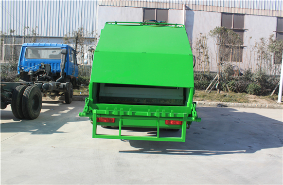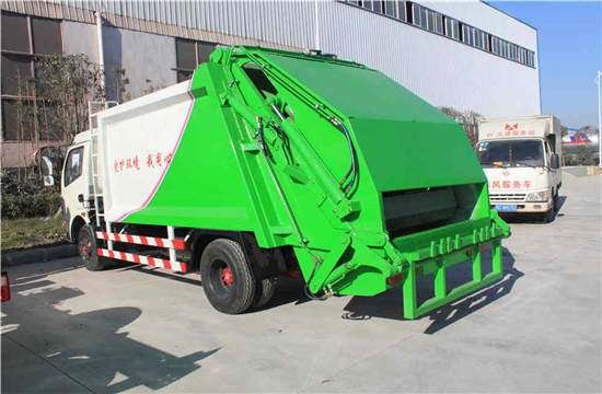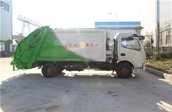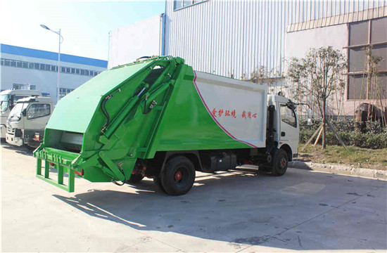 东风多利卡6吨压缩式垃圾车上装配置:有效压缩容积7-8立方,可装7吨生活垃圾,压缩倍率3-4倍,压缩后生活垃圾密度从0.36变为0.9以上,带污水收集箱,新款平板式箱体更美观,尾部带 密封橡胶垫,可防污水滴漏二次污染。尾部可带翻转斗或挂桶装置,可选装PLC一键操控系统,驾驶室和尾部双操控机构。